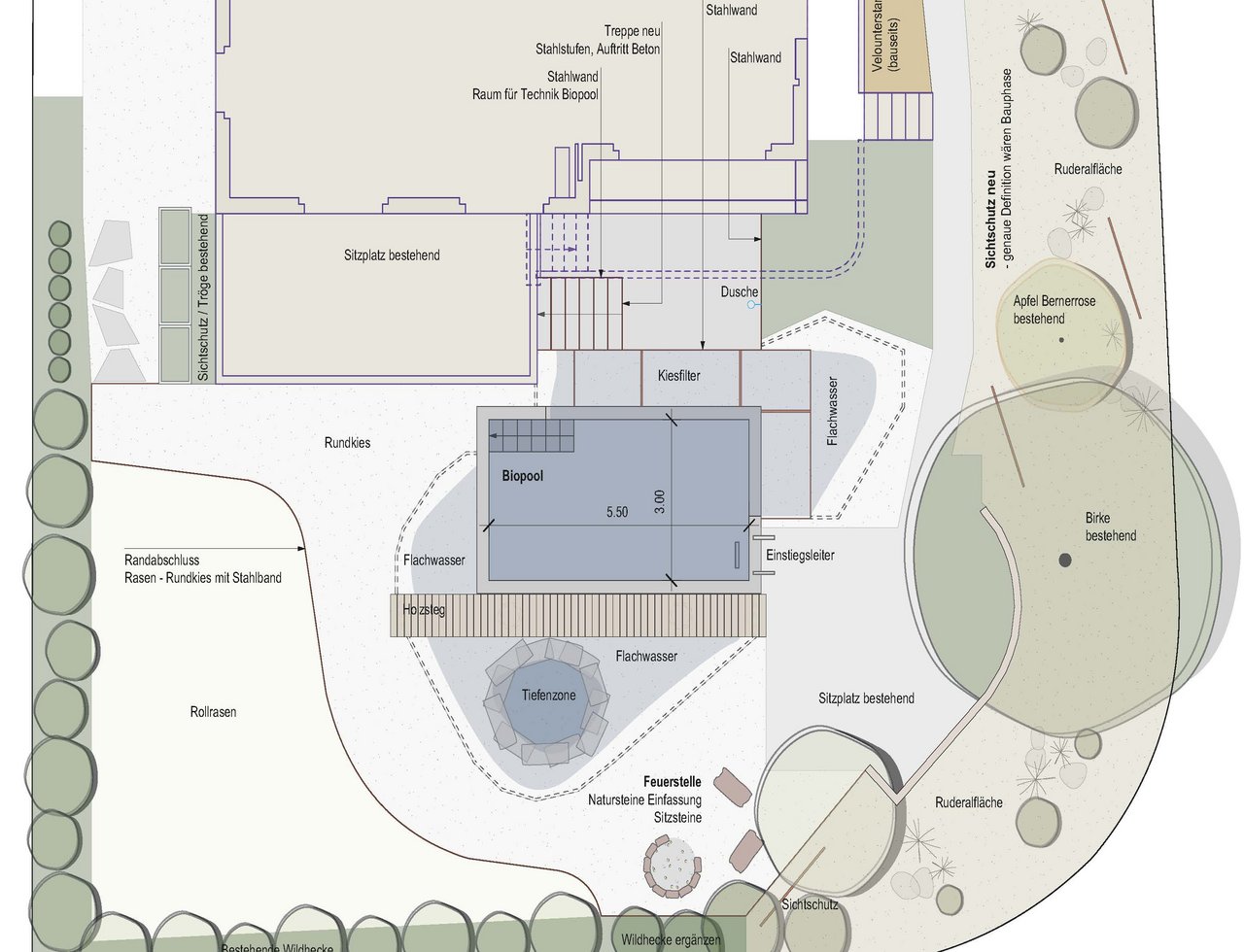 Bestehende Bereiche wie Sitzplätze und Wege wurden erneuert und angepasst, und ein Holzsteg zwischen dem Biopool und den Teichrandzonen erstellt. Rund um das Wasser entstanden gemütliche Aufenthaltsorte für alle Familienmitglieder und für verschiedene Bedürfnisse. Der Pooltraum für zuhause wurde wahr.