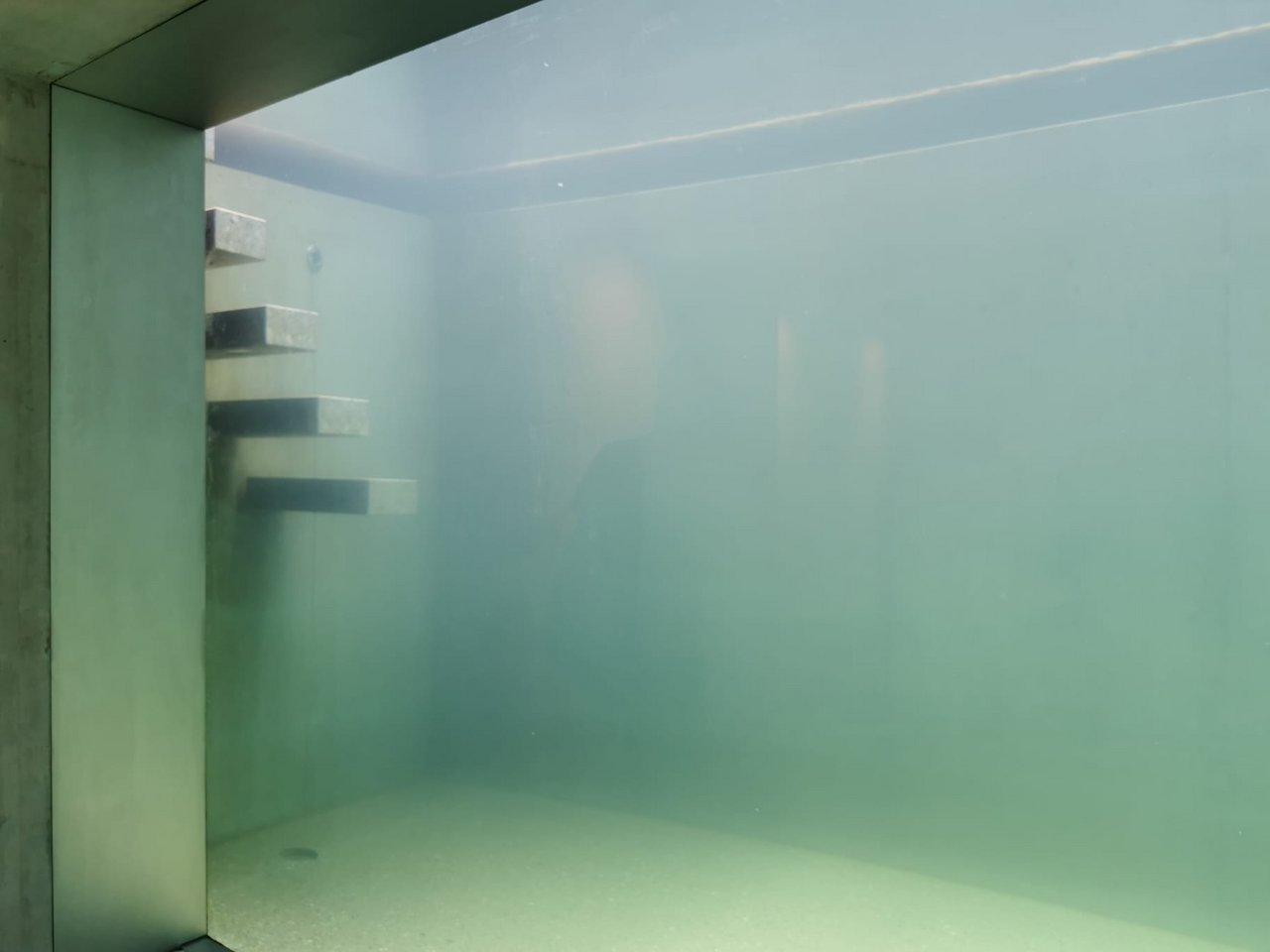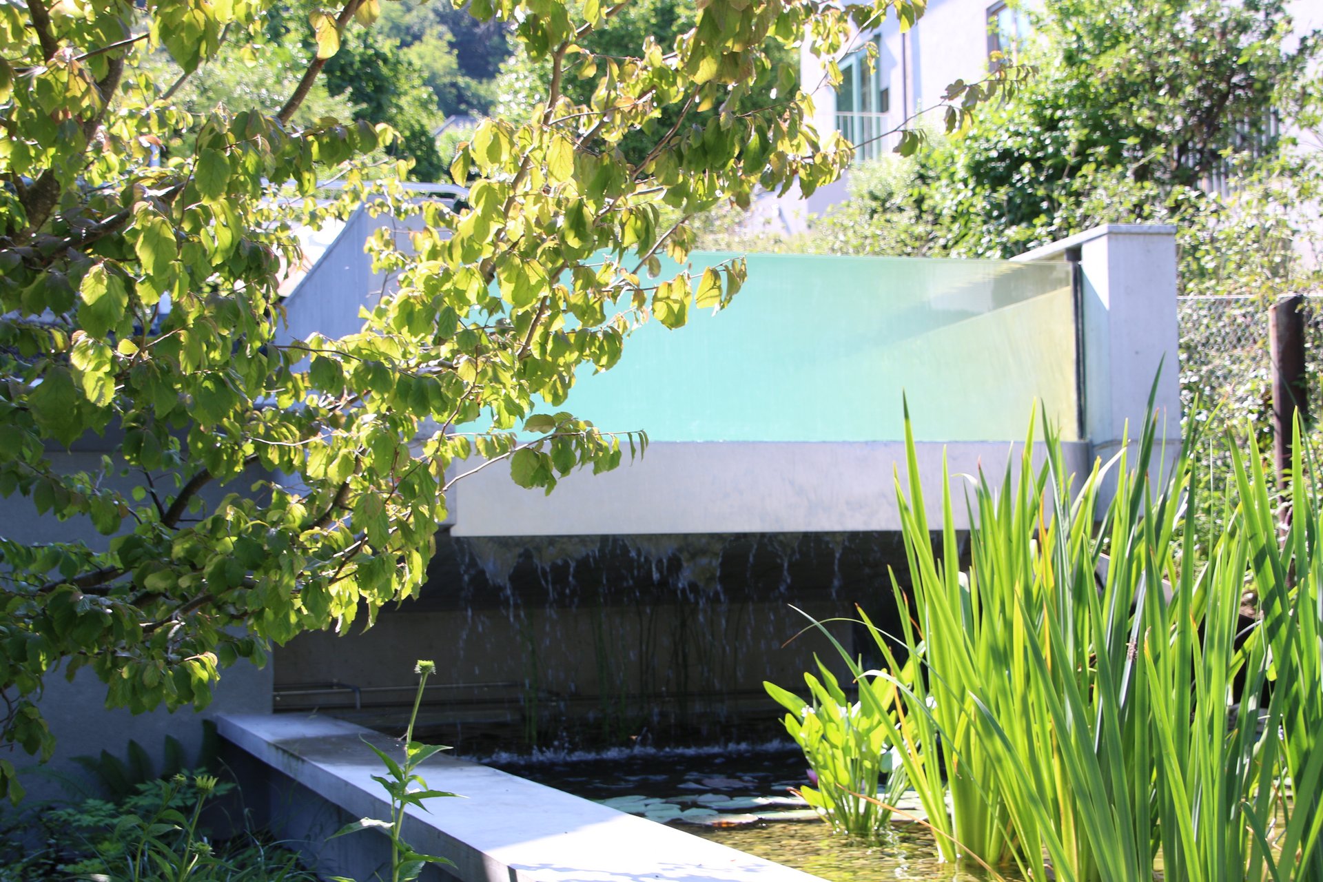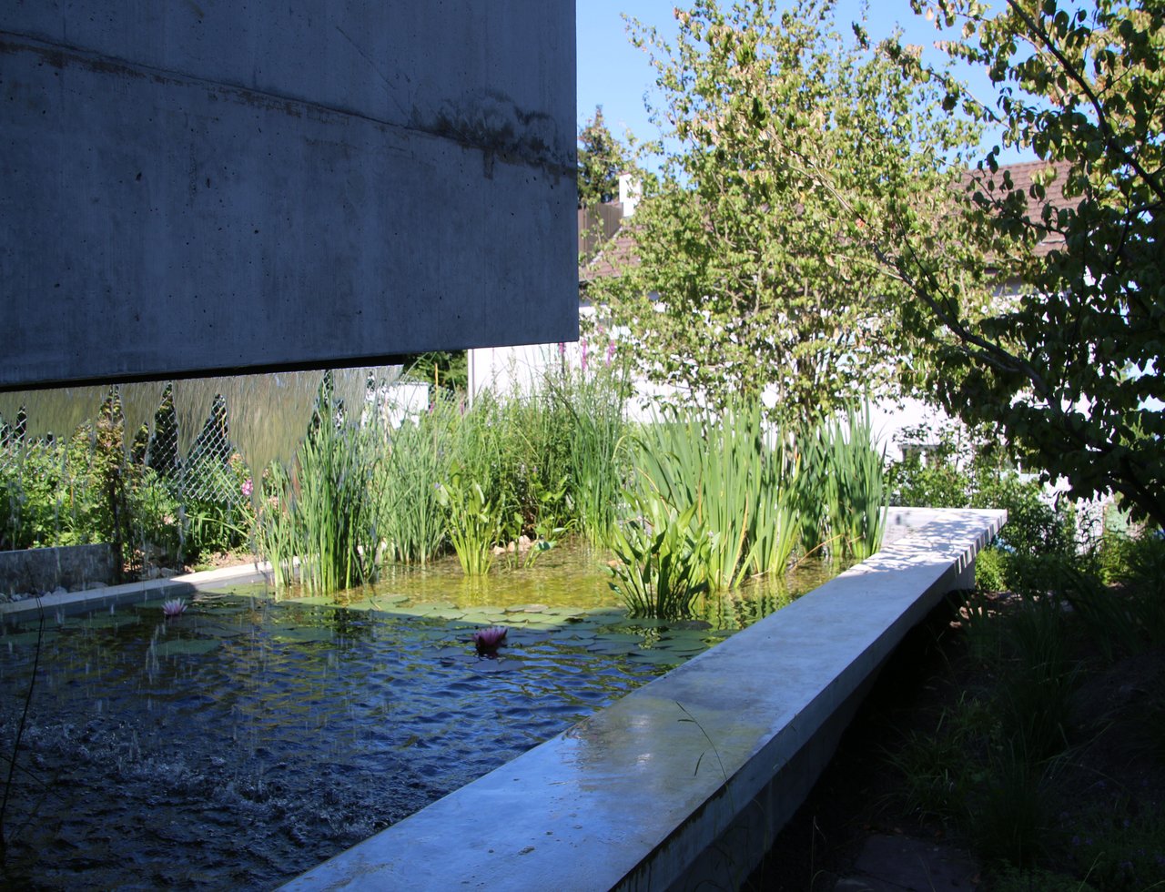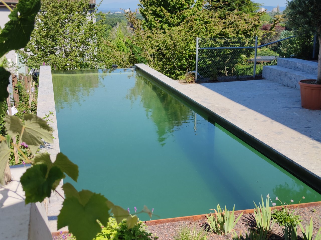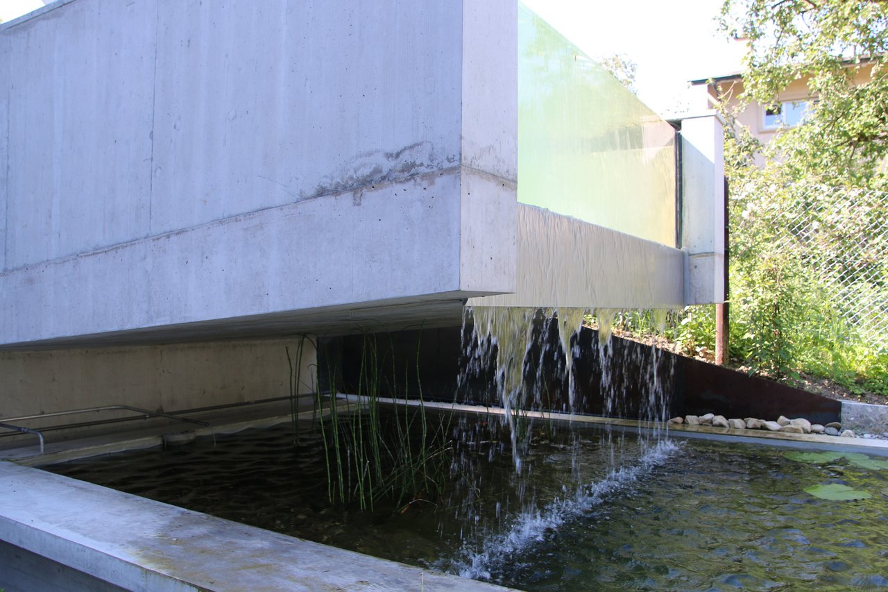 Wie aussergewöhnlich und vielfältig biologische Wasseranlagen gebaut werden können zeigt dieses extravagante, erstklassige Projekt im Raum Basel. Imposant ragt das Betonbecken des Biopools mehrere Meter freischwebend in die Gartenanlage. Am Ende des zehn Meter langen Infinity-Schwimmbeckens wurde eine Glasscheibe installiert, die als Überlaufkante dient und optisch einen herausragenden Effekt darstellt. Der Wasserfall plätschert in die bepflanzte Kiesfilterzone auf der unteren Gartenetage. Im Innenbereich des Wohnhauses ist das Wasser des Schwimmbeckes durch eine grosses Fenster sichtbar.