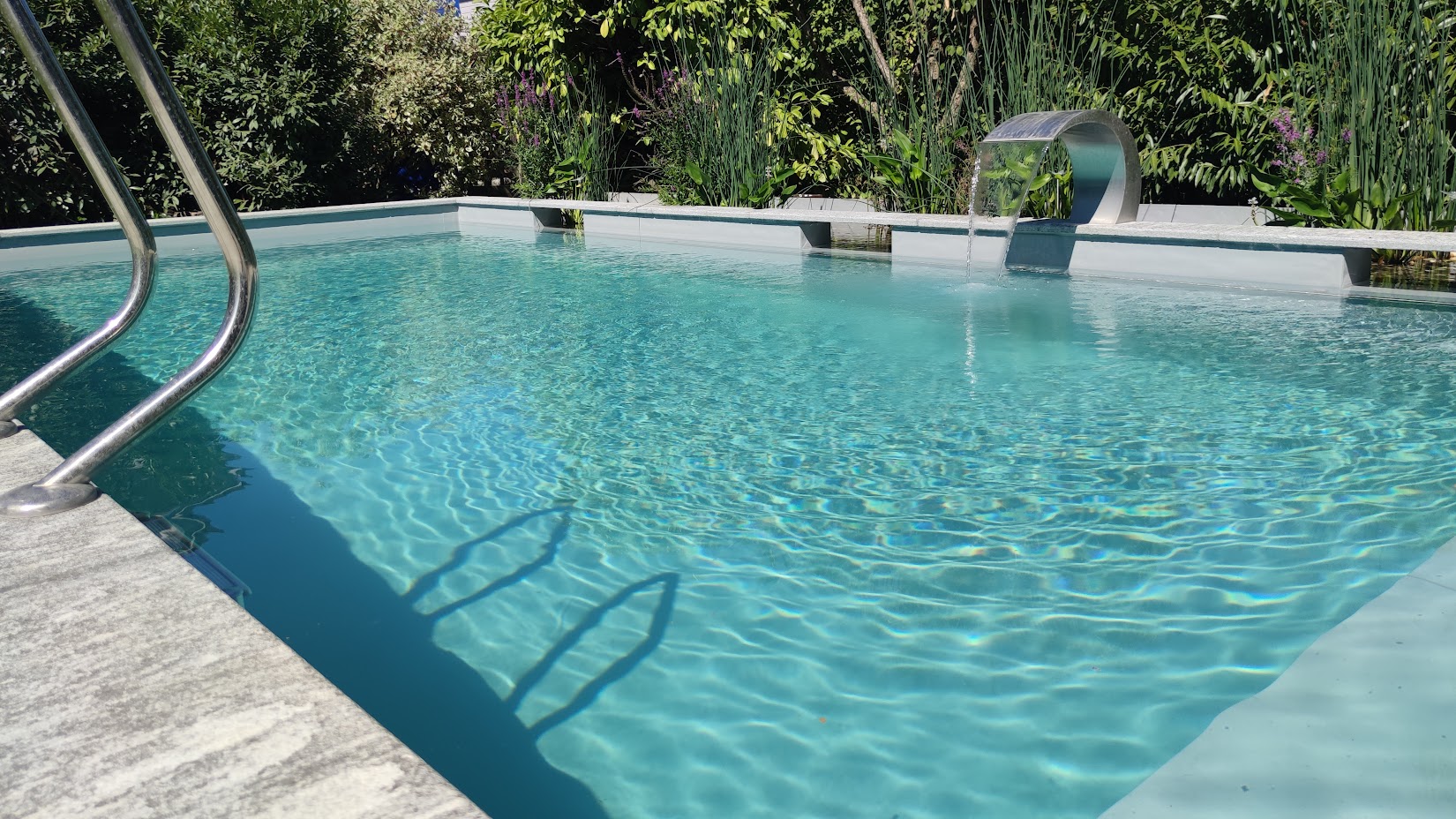 Der Wasserspeier aus Edelstahl ist ein Blickfang der Anlage und sorgt für pure Abkühlung und Wasserspass. Eine integrierte Gegenstromanlage wird für Fitnesseinheiten im Wasser genutzt und die Unterwasserbeleuchtung liefert in den Abendstunden eine tolle Atmosphäre. Der Familiengarten ist perfekt.