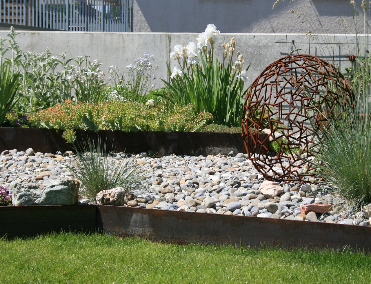 Ein neues Wohngefühl entstand. Steinkörbe, Wege, Sitzplatz und Staudenbeete sind die Hauptbestandteile dieser Gartenumgestaltung. Ein neu angelegter Weg führt rund um das Wohnhaus und endet an einem heimeligen Sitzplatz. Die Pflanzenbeete, geschmückt mit Stauden und Kunst, sind umfasst von modernen Elementen aus Cortenstahl.