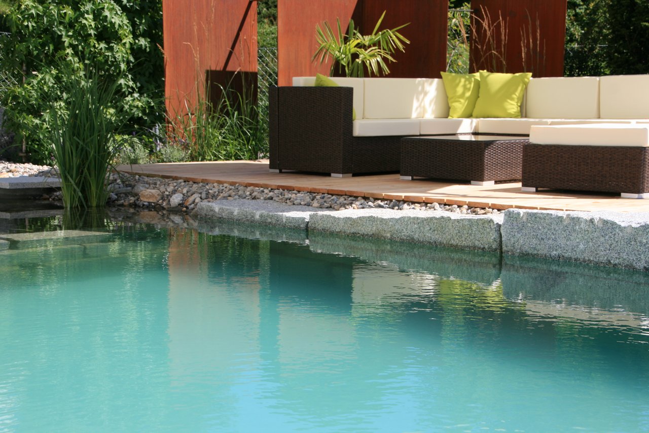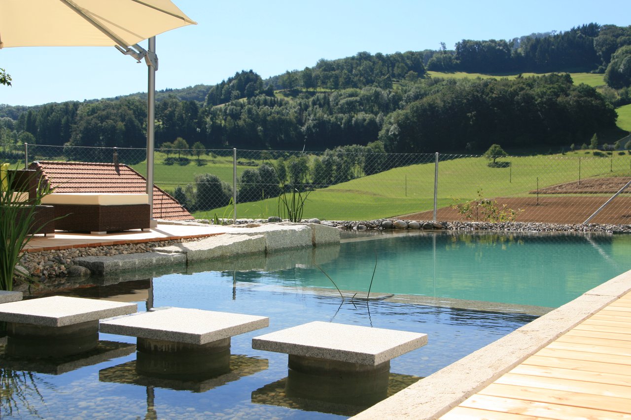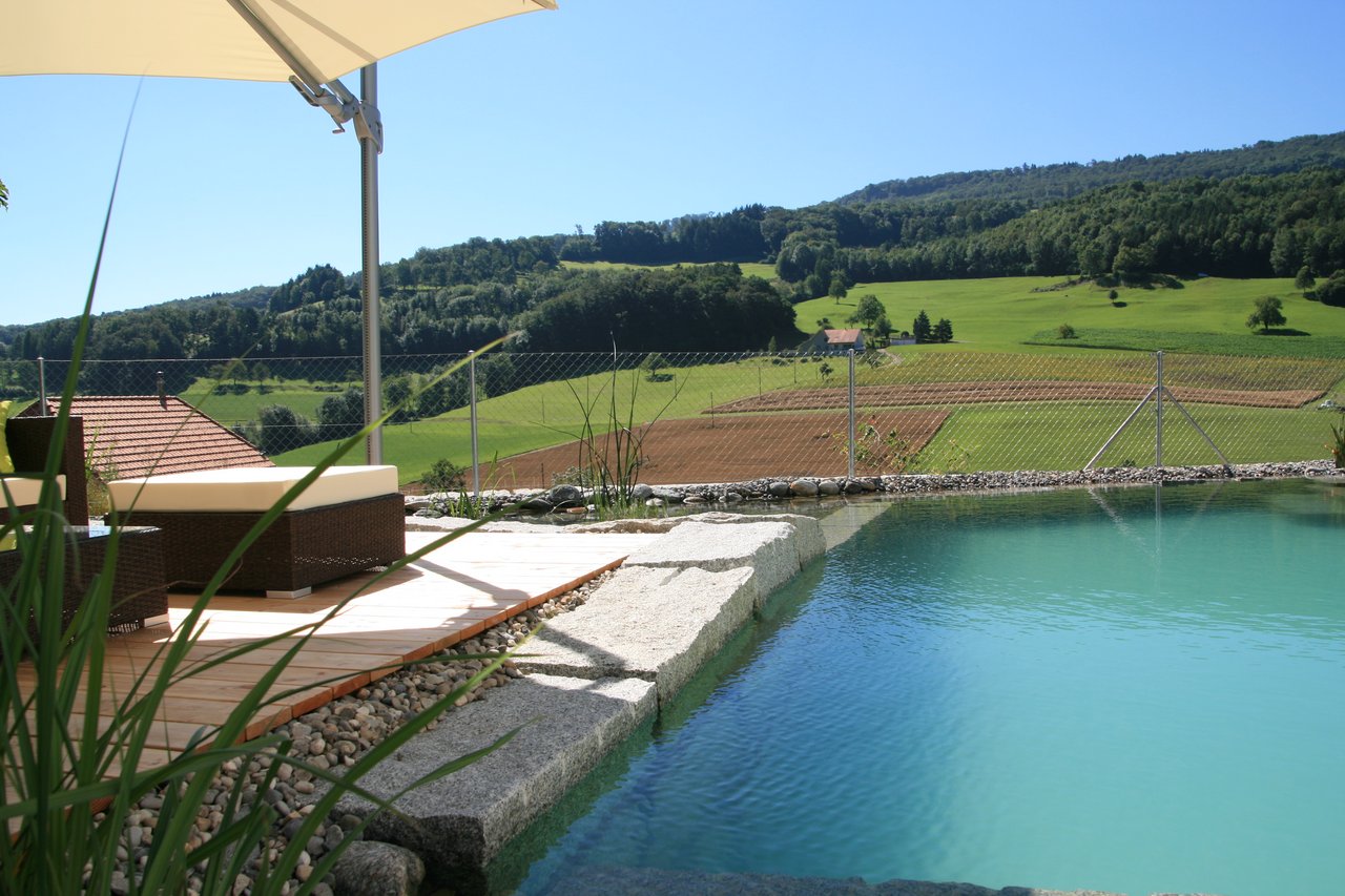 Ein Schwimmteich, gemütliche Sitzplätze und eine wunderbare Aussicht in die Landschaft - das sind die wesentlichen Elemente dieses Gartens, die das Wohnen draussen zum Genuss machen. Der Gartenbereich des Einfamilienhauses konnte mit vorausgehender, wohl überlegter Planung optimal gestaltet werden. Harmonisch aufeinander abgestimmte Materialien wie Stahl, Holz und Naturstein in Kombination mit Wasser fügen sich zu einer stilvollen Gesamtanlage, die verschiedene Möglichkeiten bietet, die Natur zu allen Jahreszeiten zu erleben.