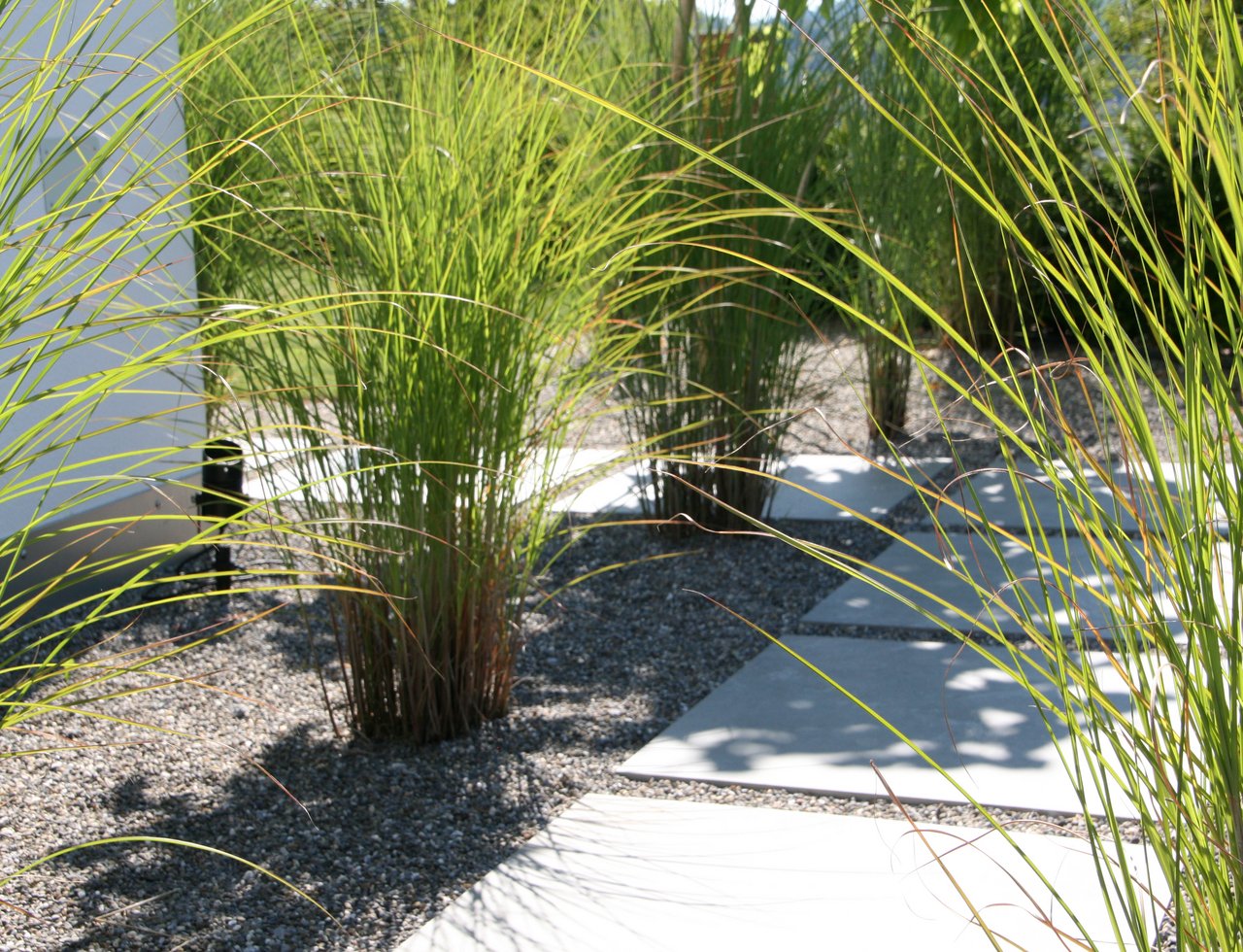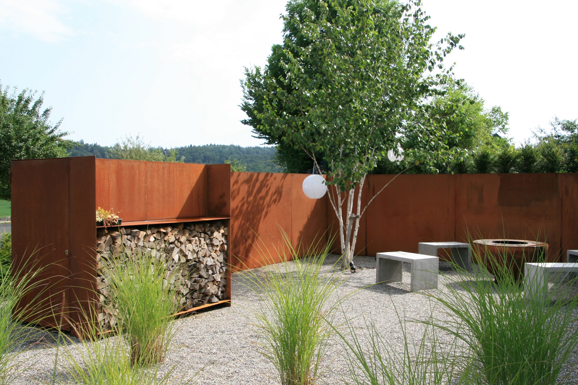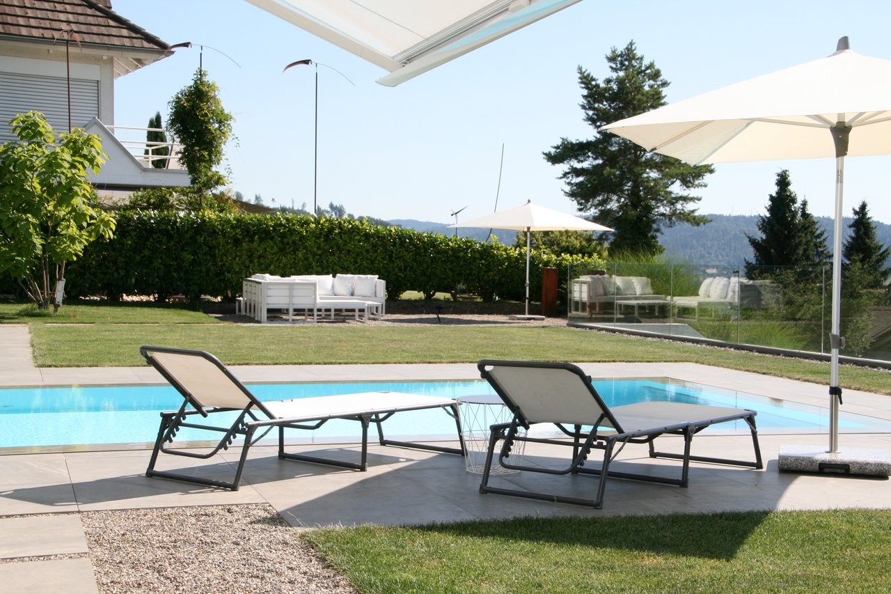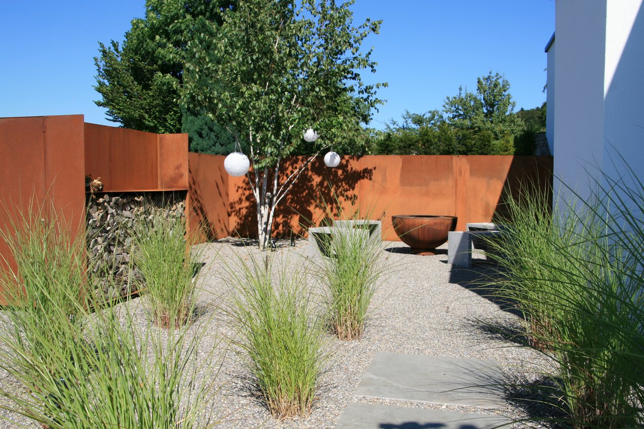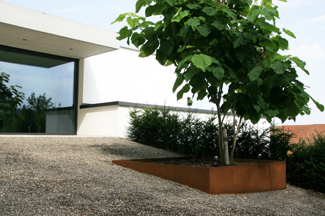 Ziergräser ragen aus den schlichten Kiesflächen und bewegen sich leise im Wind. Umgeben von Sichtschutz aus rostigen Stahlplatten entstand auf der Westseite des neuen Wohnhauses ein einladender Sitzplatz mit Grill- und Feuerstelle. Ein Plattenweg aus elegantem Steinmaterial verbindet die verschiedenen Aufenthaltsorte der Gartenanlage. Zentral, und im Anschluss an die gedeckte Terrasse, geniessen die Gartenbesitzer über die Sommermonate eine Abkühlung am Pool. Der Eingangsbereich präsentiert sich stilgetreu, während ein prächtiger Trompetenbaum mit auffallender Wuchsform einen speziellen Akzent setzt.