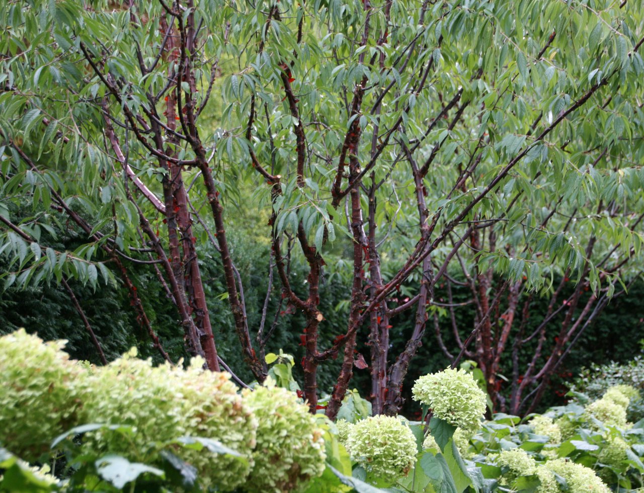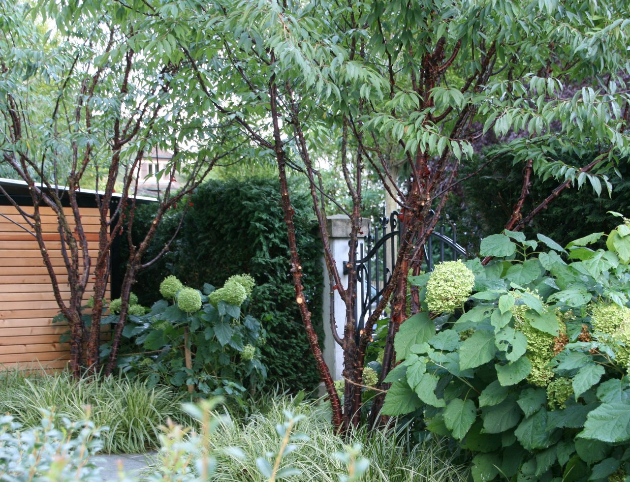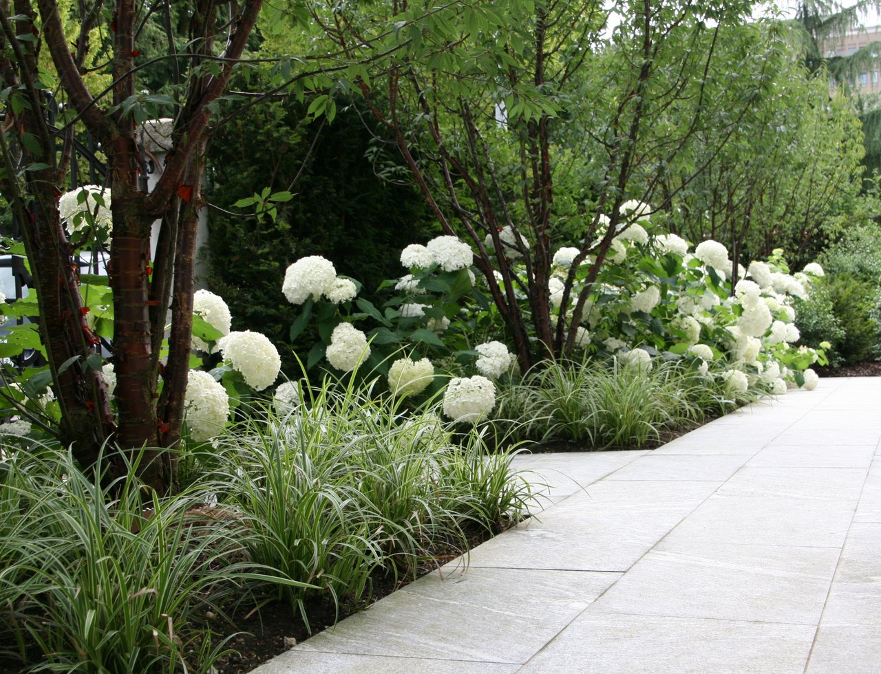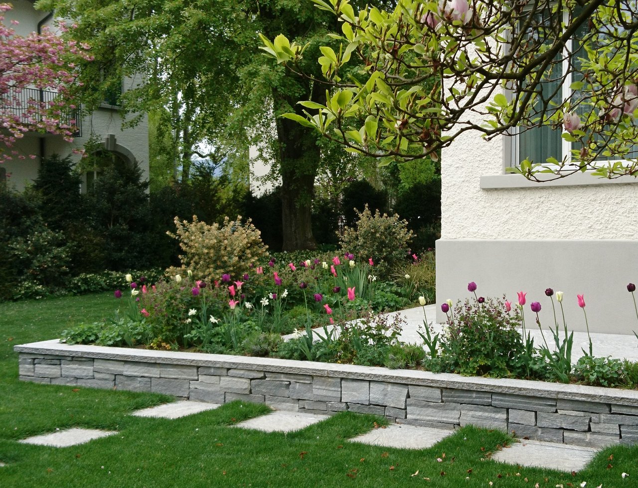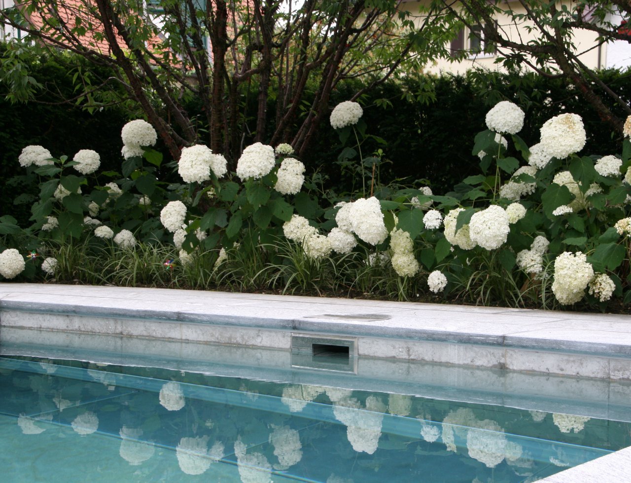 Umrahmt mit immergrünen Hecken werden die Gartenbesitzer eingangs von zahlreichen Hortensien, Duftblüten und Solitärgehölzen begrüsst. Wege aus hochwertigen Granitplatten führen zu den verschiedenen Gartenräumen. Eine stattliche, charakterstarke Magnolie in der Rasenfläche ist eines der Herzstücke des ursprünglichen Gartens, und konnte glücklicherweise erhalten bleiben. Der natürliche Schatten des Baumes ist unersetzlich, die Blüten im Frühjahr eine reine Augenweide.