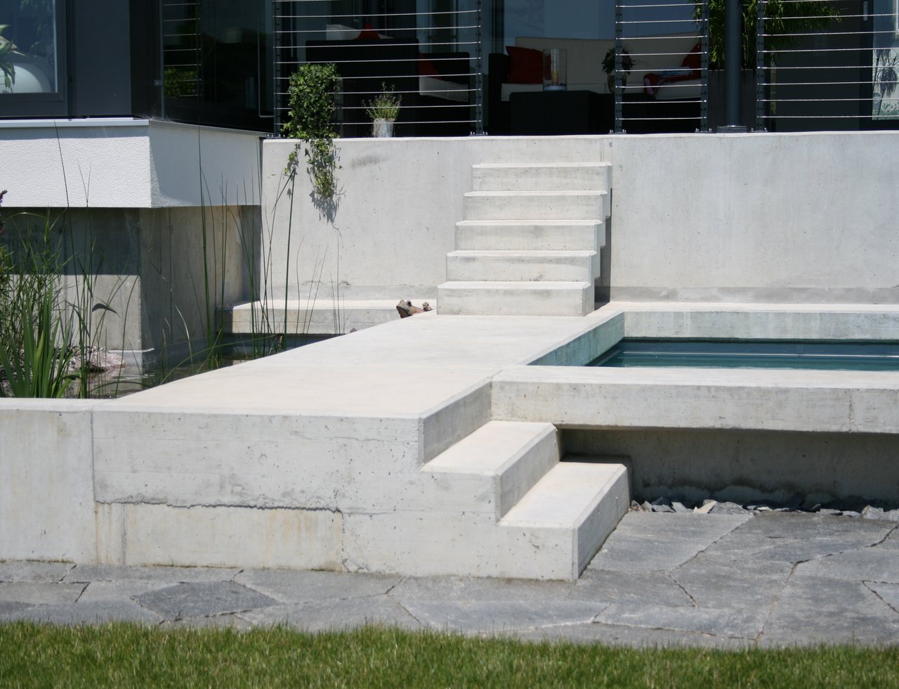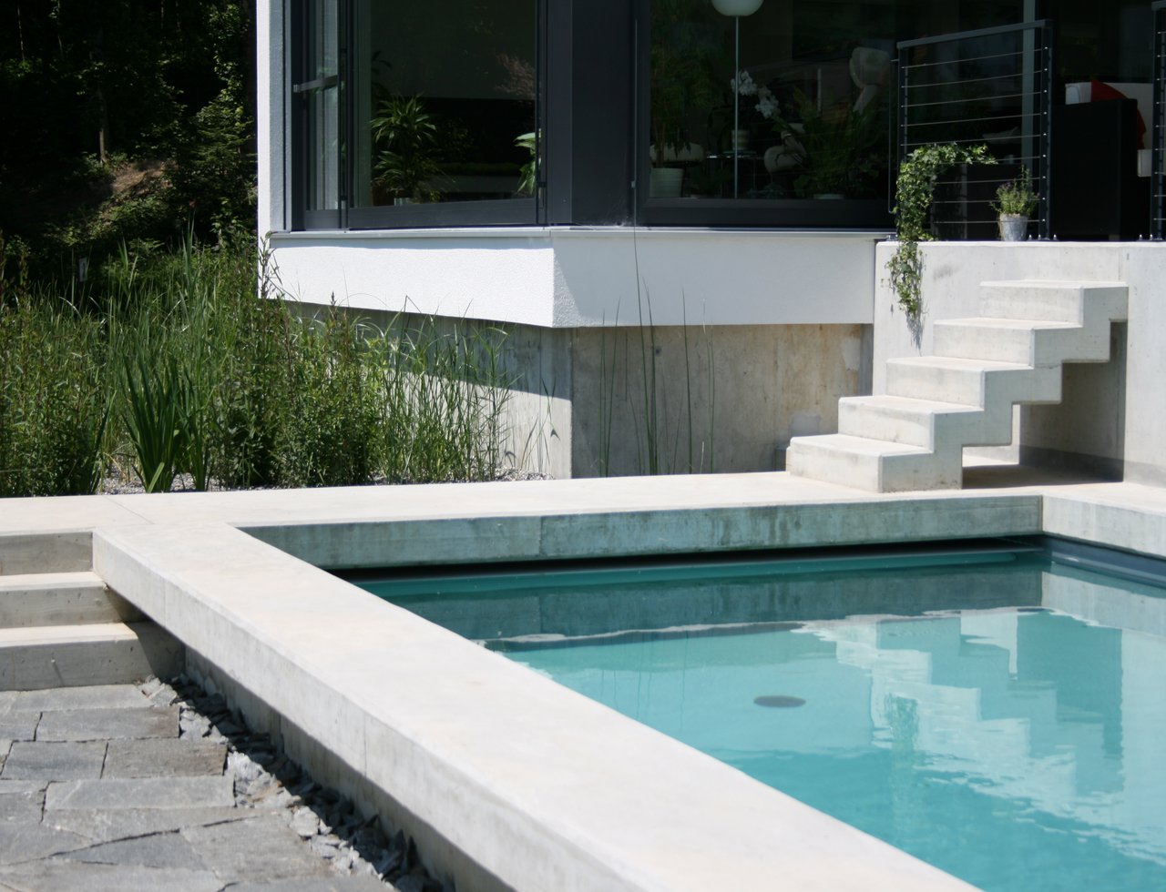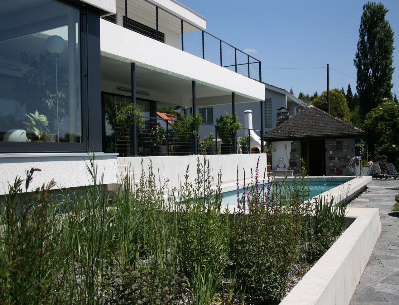 Die klassich moderne Architektur des Einfamilienhauses wurde stilgetreu auf den Garten übernommen. Der integrierte Biopool schliesst direkt an den Terrassenbereich an und ist mit einer Schwimmfläche von 4 auf 12 Meter grosszügig bemessen. Ein kleiner Seerosenbereich schmückt zierlich die Teichanlage.