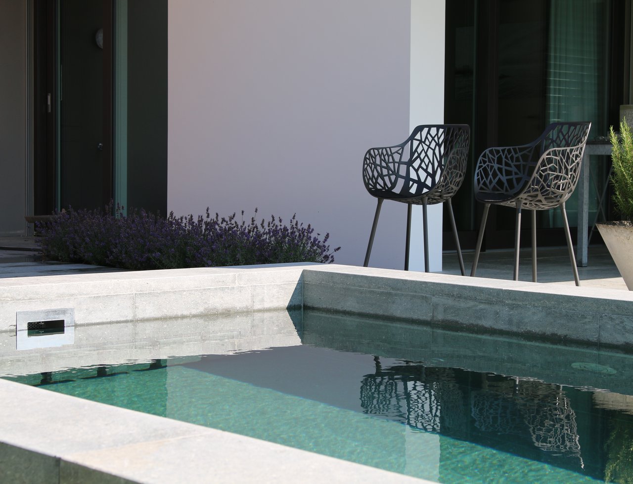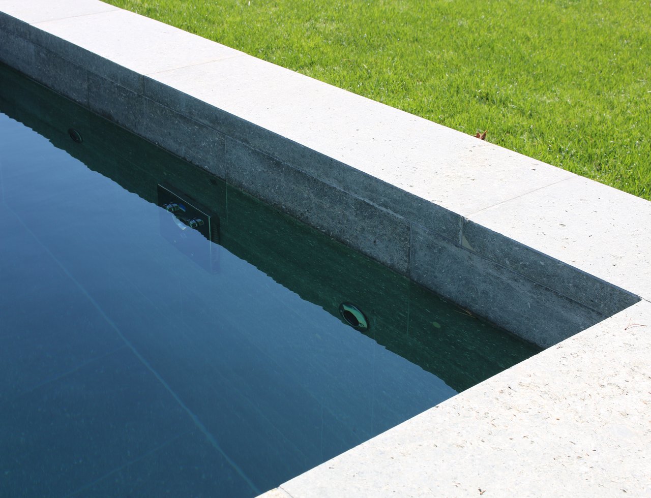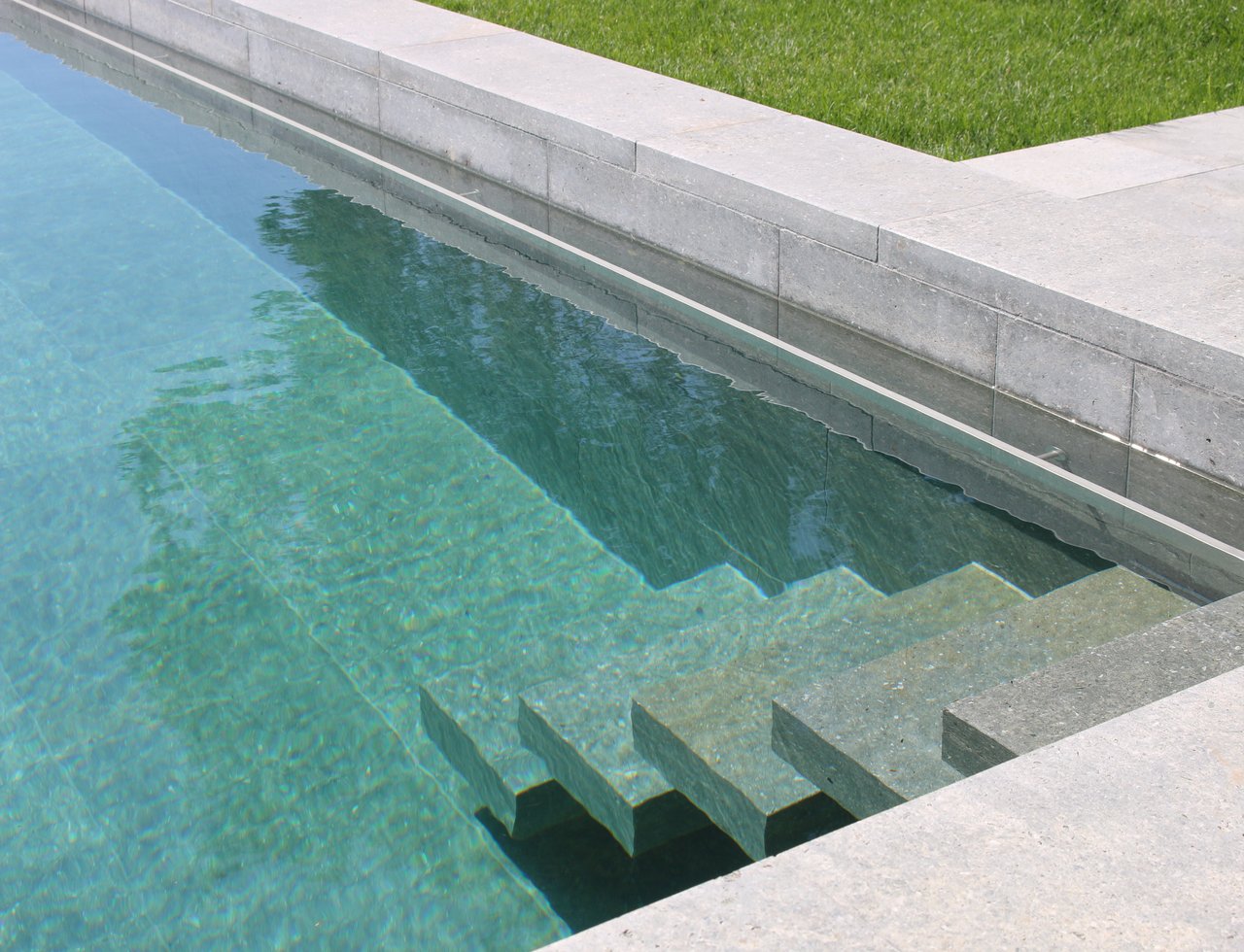 Grosszügige Terrassenplätze ermöglichen herrliche Aufenthaltsorte im Grünen. Puristisch und ästhetisch präsentiert sich dazu dieser Naturpool, ausgestaltet mit äussert hochwertigen Materialien. Der anthrazit farbige Muschelkalk ist einzigartig und fand für die gesamte Anlage Verwendung. Die Wasseroberfläche glitzert in der Sonne, die frei schwebende Pooltreppe ist ein echter Blickfang. Technisch auf höchstem Niveau begeistert der Naturpool zum Schwimmen, Wellnessen und Wohnen mit Wasser im Garten.