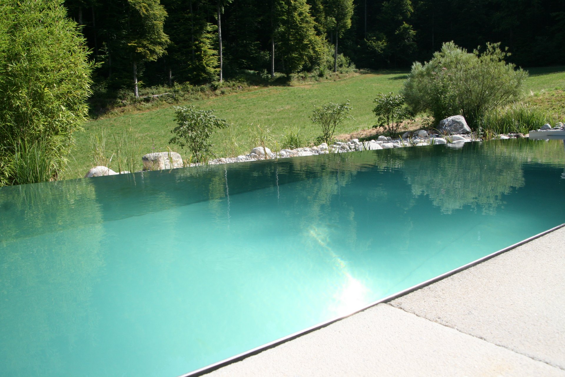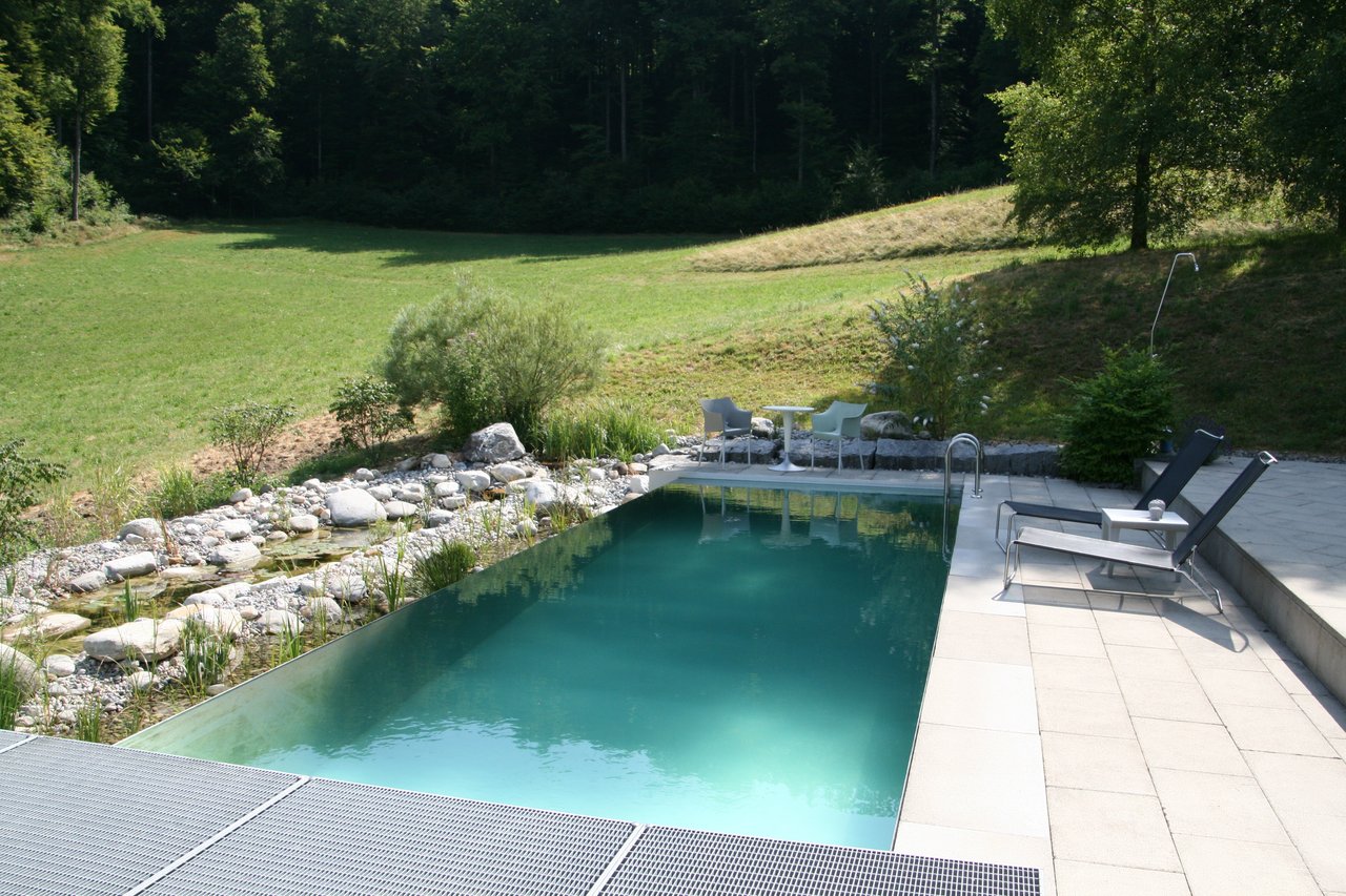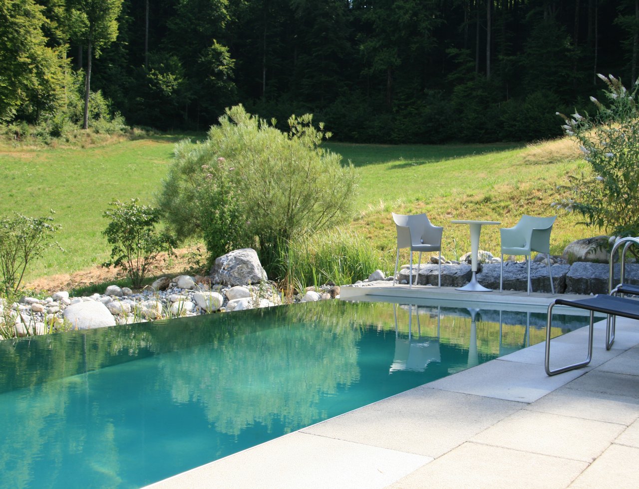Die damals gestalteten Rand- und Kiesfilterbereiche wurden für die biologische Wasseraufbereitung gebraucht, und beim Umbau des Schwimmteiches umfunktioniert. Der Schwimmteich wurde zu einem Biopool, oder auch Naturpool genannt, umgestaltet. Das renovierte Schwimmbecken, ausgekleidet mit dem Trendmaterial Edelstahl, wirkt sehr chic in der natürlichen Umgebung am Waldrand. Die Wasserreinigung findet nach wie vor auf biologische Weise statt. Ein Sandfilter unterstützt das hervorragende Reinigungssystem.