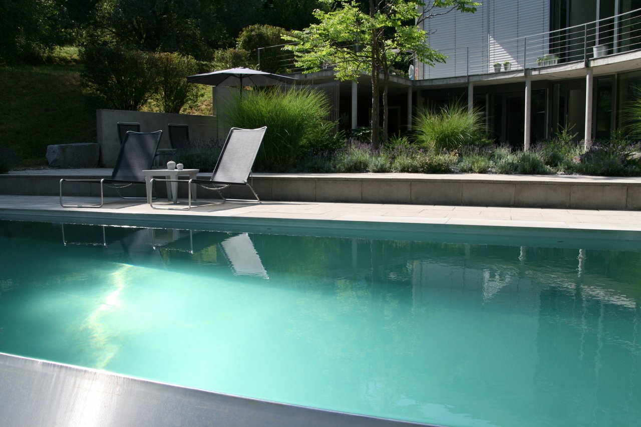 Edelstahl und Biopool bauen, wie passt das zusammen? Der 1999 gestaltete Garten mit einer Schwimmteichanlage bedurfte nach vielen Jahren einer Renovation. Die Gartenanlage erhielt ein völlig neues Erscheinungsbild.