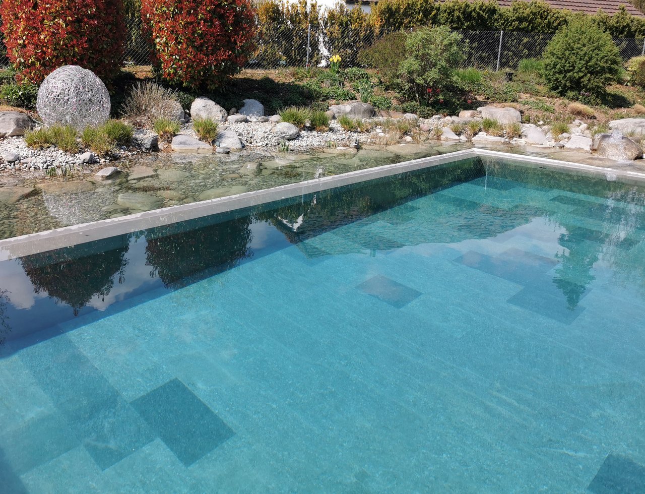 Die Umgestaltung und Renovation eines klassischen Schwimmteiches zu einem Biopool der Kategorie 4 war die Kernaufgabe dieses Projektes. Die bisher fliessenden Übergänge von Schwimmbereich und Regenerationszonen wurde aufgehoben und durch ein Betonbecken räumlich voneinander getrennt. Klare Linien zeichnen sich nun an der Wasseroberfläche ab und verstärken optisch den Charakter der Architektur. Die bestehenden Regenerationsbereiche umgeben auf drei Seiten das neue Schwimmbecken und vermitteln durch die Gestaltung mit vorhandenen Findlingen, Kieszonen und Wassergräsern Natürlichkeit und ökologische Werte. Durch die Gegensätzlichkeit von Moderne und Natur werden in dieser biologischen Wasseranlage spannende und abwechslungsreiche Gartenbilder geschaffen. Die Besitzer geniessen einen neuen Wohnraum am Wasser.