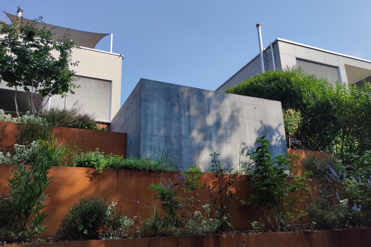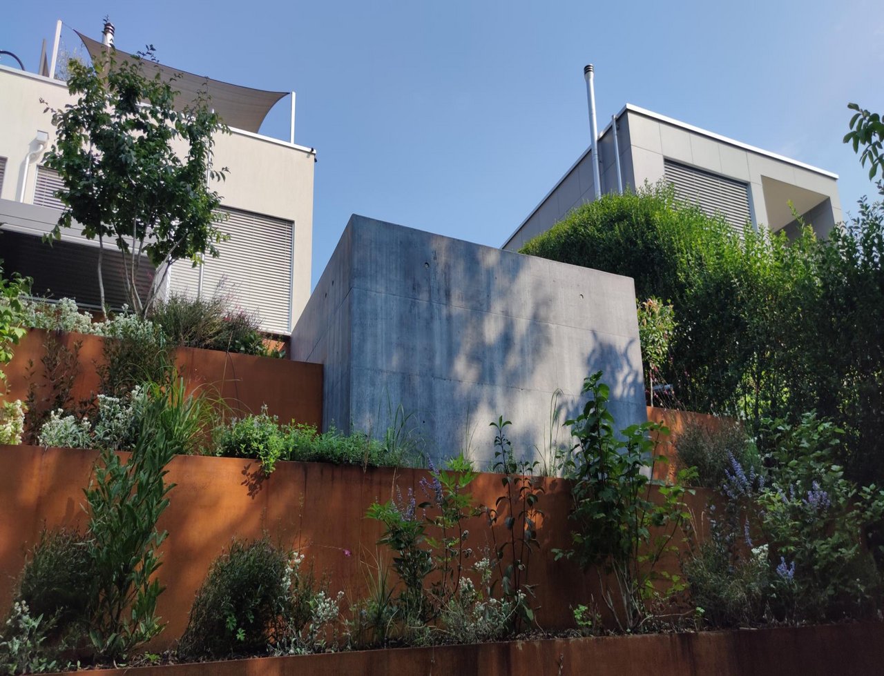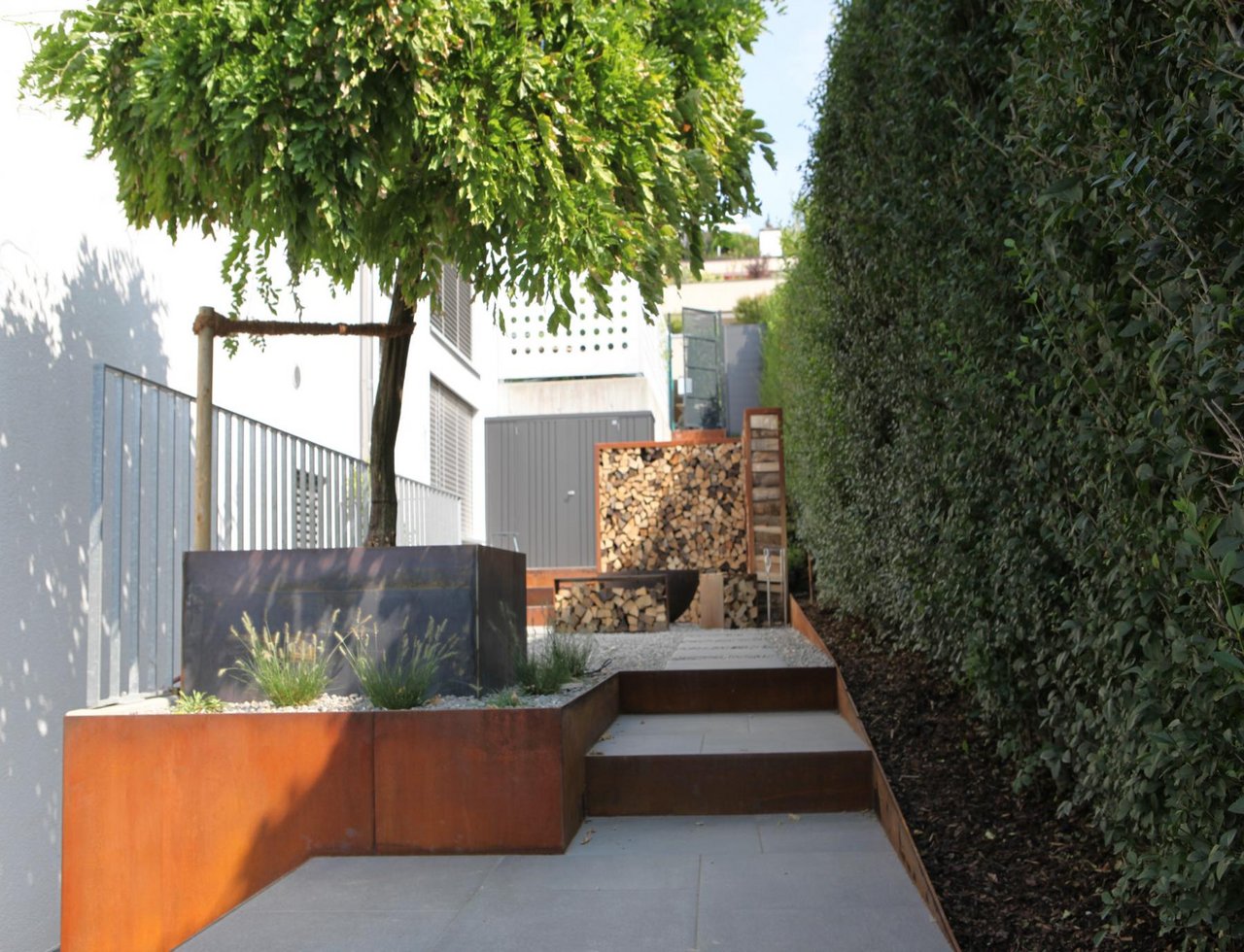 Die mehrfachen Terrassierungen im Gelände machen die Gartenanlage sehr spannend. Bereits der Zugang in den Garten beginnt mit Treppenabstufungen, eingefasst von Stahlwänden, und einladend zum ersten Sitzplatz. Die Feuerstelle mit kleinem Sitzplatz wird ein Treffpunkt werden.