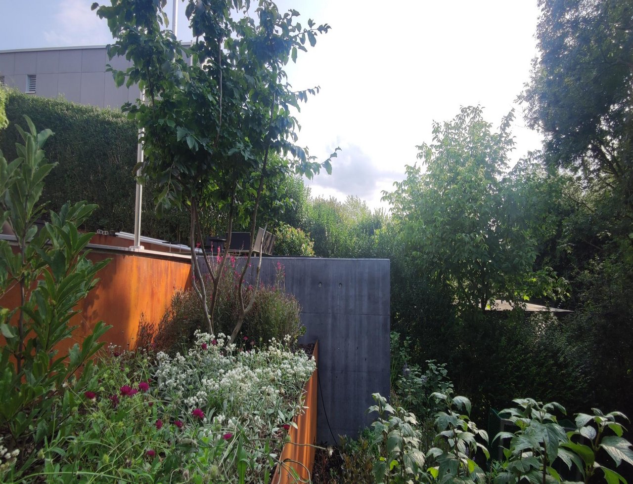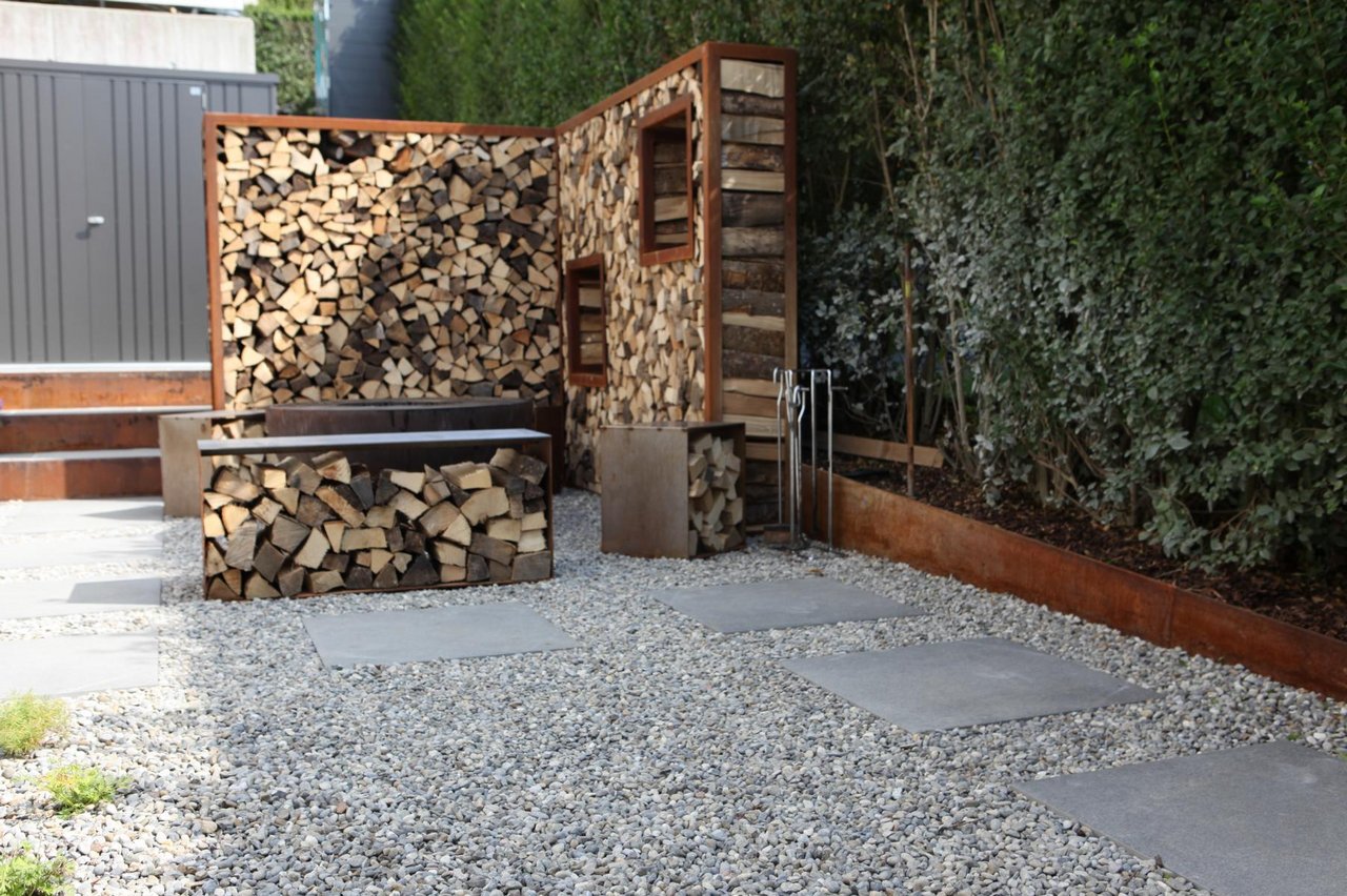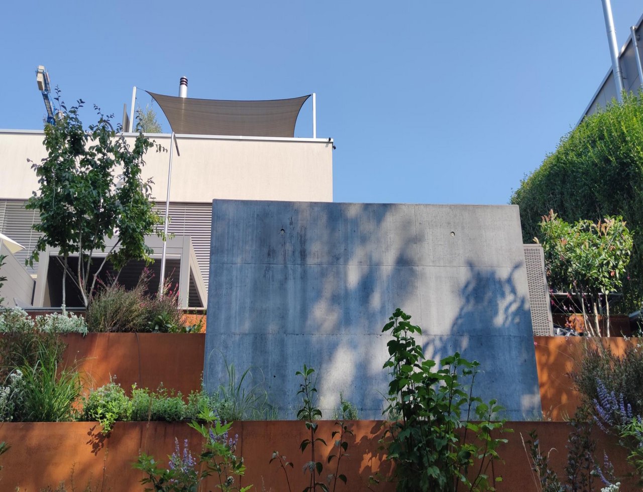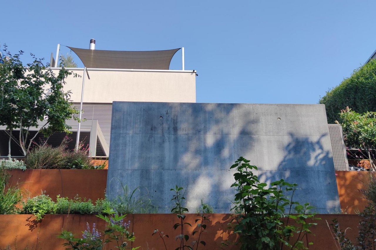 Die mehrfachen Terrassierungen im Gelände machen die Gartenanlage sehr spannend. Bereits der Zugang in den Garten beginnt mit Treppenabstufungen, eingefasst von Stahlwänden, und einladend zum ersten Sitzplatz. Die Feuerstelle mit kleinem Sitzplatz wird ein Treffpunkt werden.