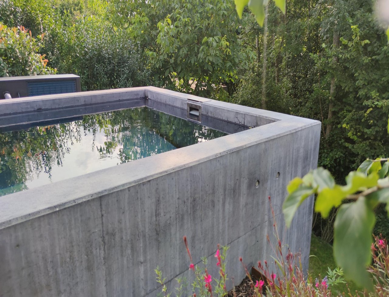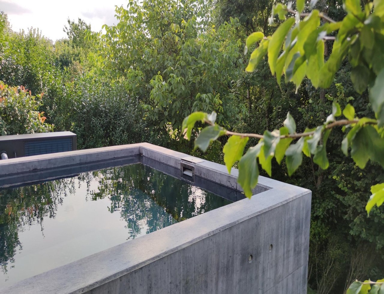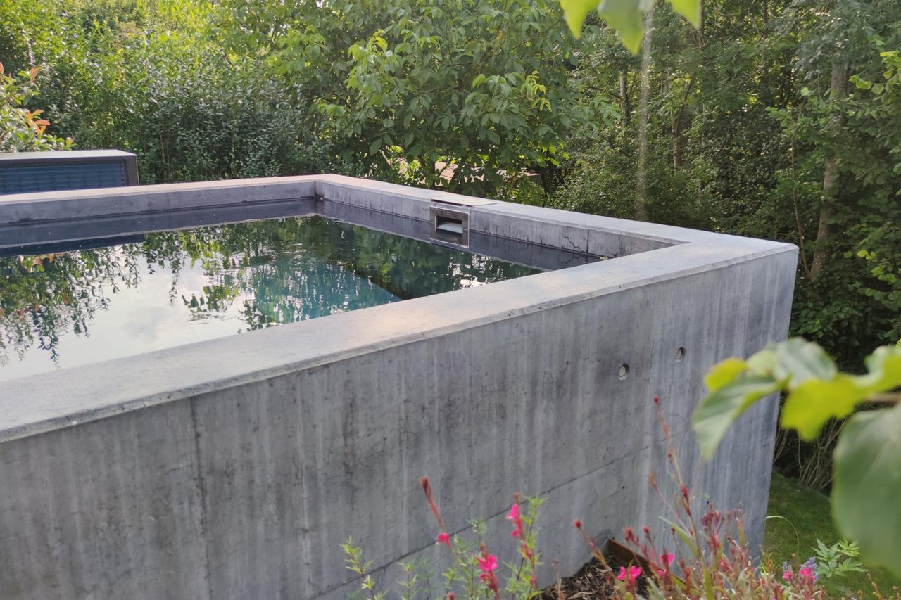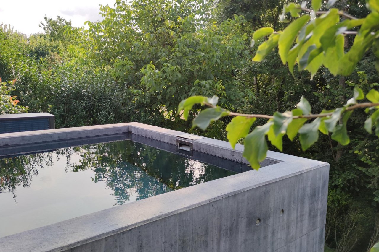 Ausserordentlich und erstmalig ausgeführt kam für den Bau des Schwimmbeckens anthrazit eingefärbter Beton zur Verwendung. Der optische Aspekt ist einzigartig, das Wasser zeigt sich in intensiv blau.
