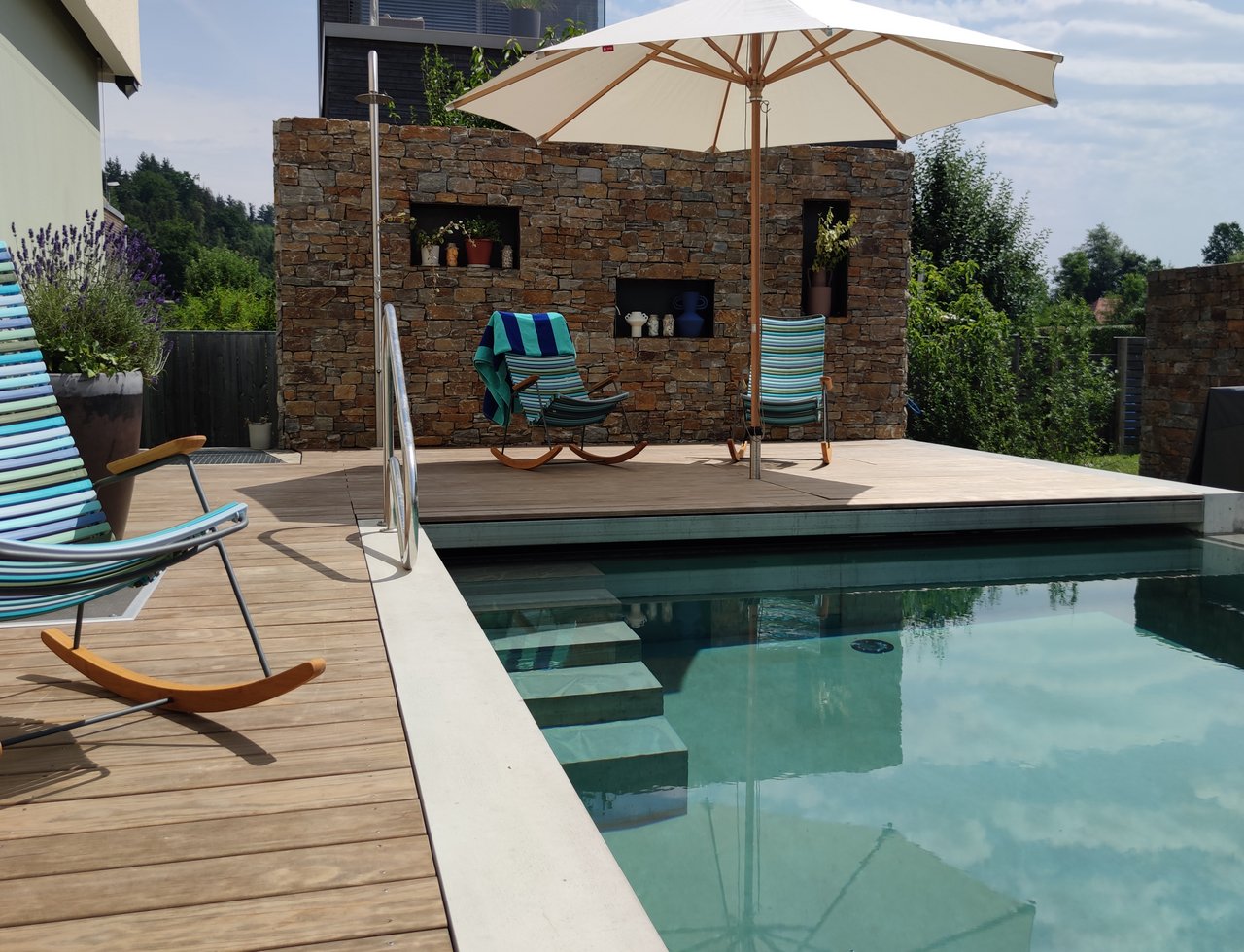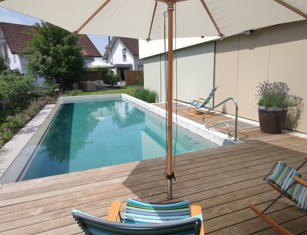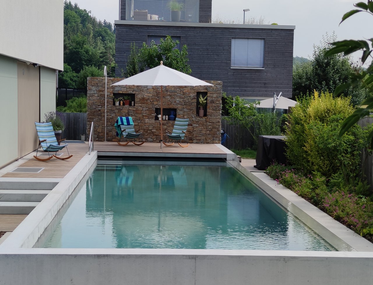 Das grosszügige Swimmingpool, gestaltet als Betonbecken mit einer Überlaufkante, wurde massgenau zwischen der Hausfassade und der Grundstücksgrenze projektiert und eingepasst. Eine Sichtschutzwand mit Verblendmauerwerk und ein blühender Gehölzstreifen entlang des Pools bilden einen harmonischen Rahmen zur Umgebung des Wohnquartiers.
