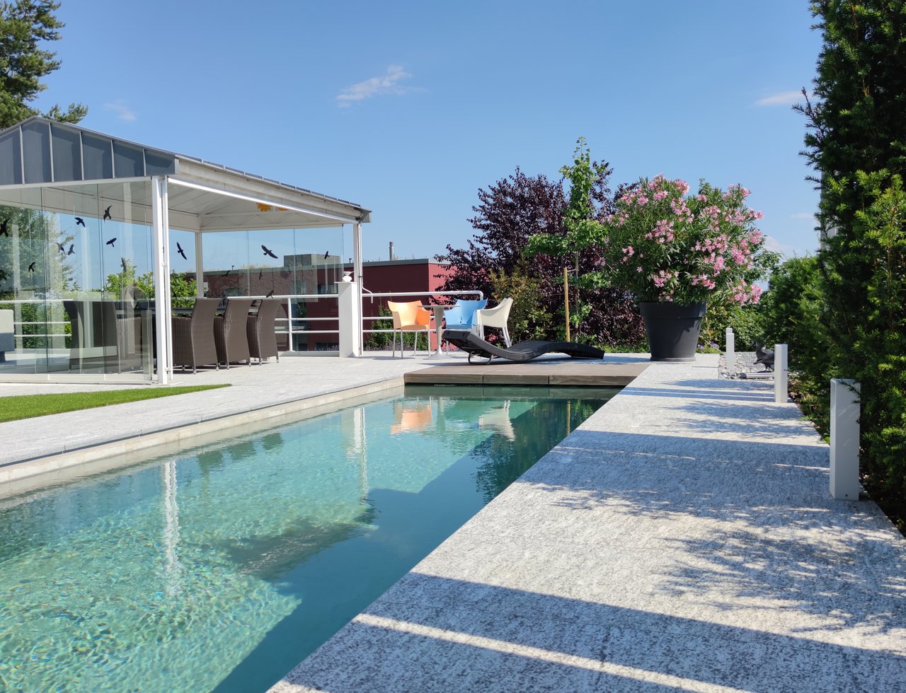 Gerade Linien, übernommen von der Architektur, und einheitliche Materialien und Farben bringen Struktur und Entschlossenheit in die Gartenanlage. Das lange Schwimmbecken mit einer Grösse von 10x2.5 Meter ist mit einer Gegenstromanlage ausgestattet. Sportliches Schwimmen ist hier möglich. Harmonische und gemütliche Abendstunden rund um den Swimmingpool sind durch die integrierte Beleuchtung garantiert.