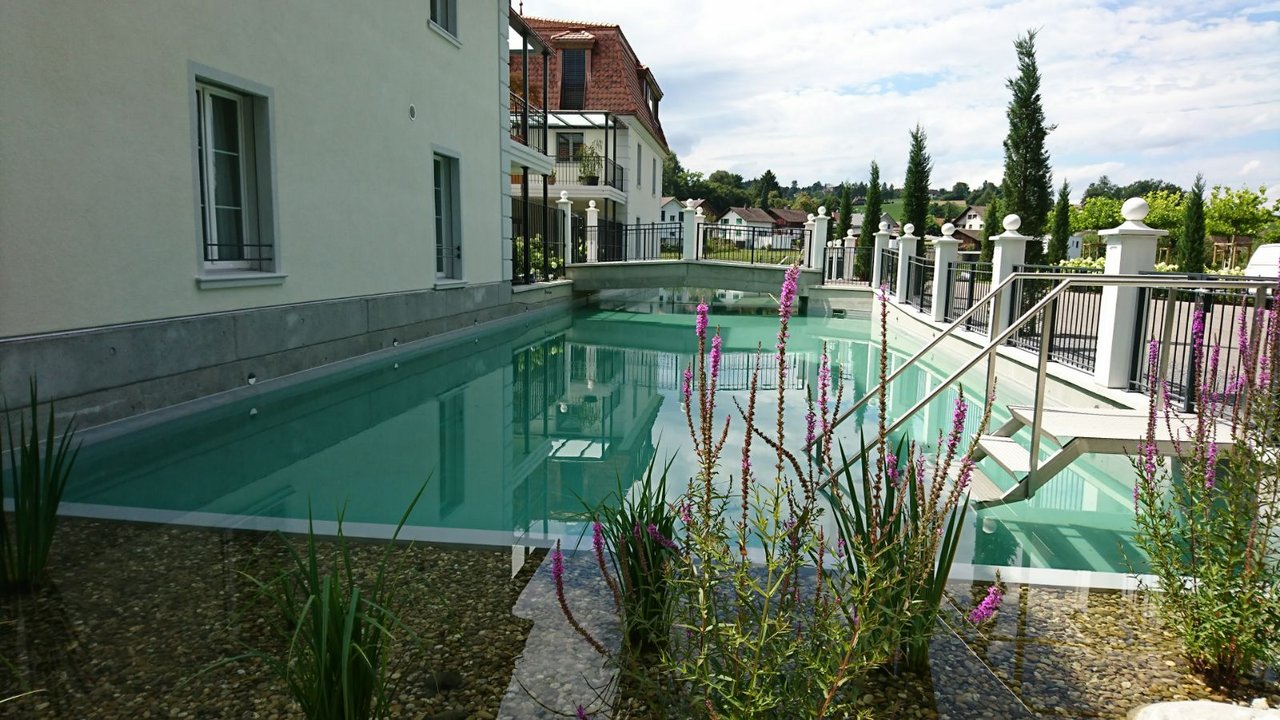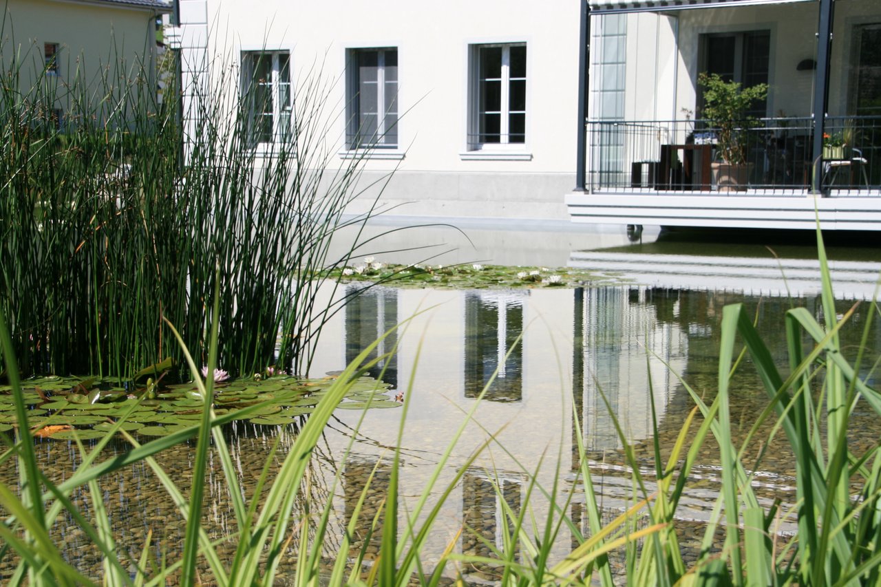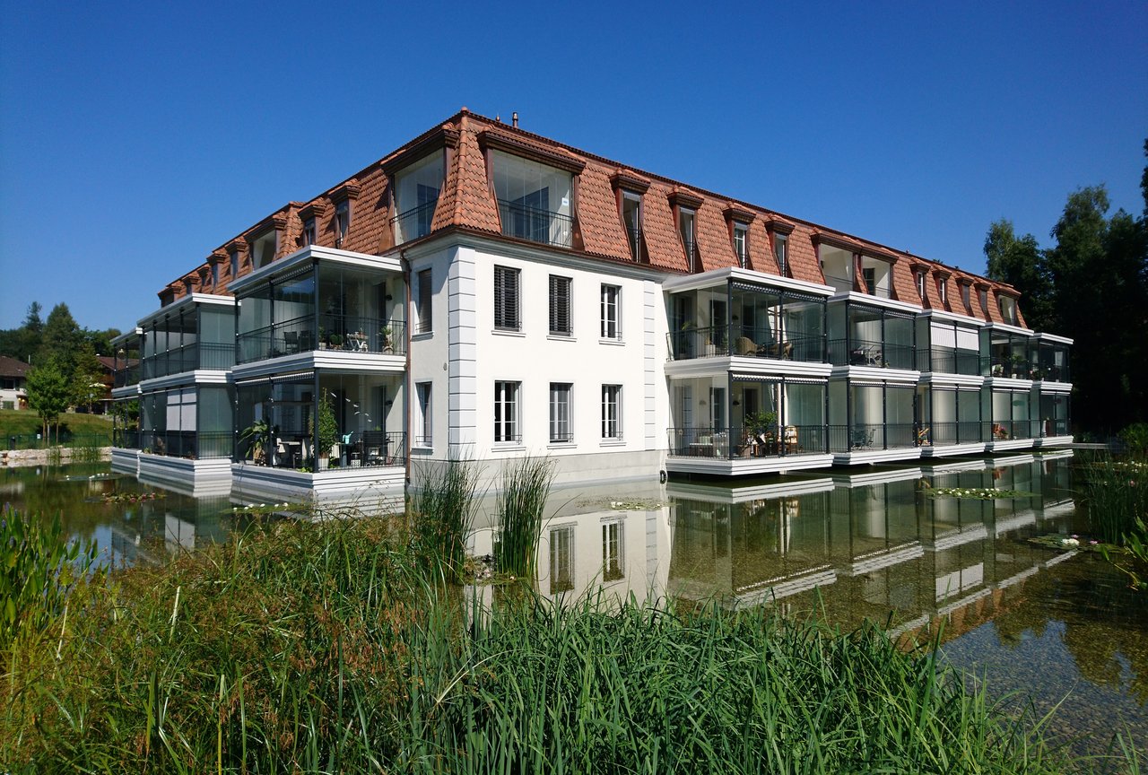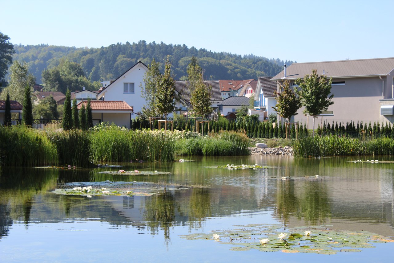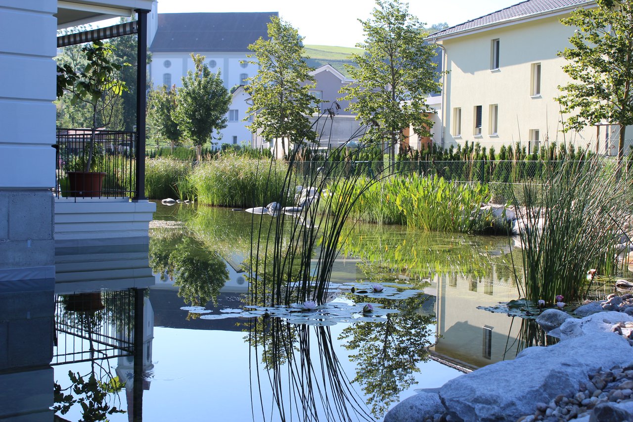 Die idyllische Weiherlandschaft umrahmt die exklusive Wohnanlage in herrlich grüner parkähnlicher Umgebung. Im Sommer zieren eine Vielfalt von Sumpfpflanzen und Wassergräsern die unterschiedlichen Teichbereiche, während sich zahllose Seerosen, Wasserlilien und andere spezielle Blüten in ihrer Pracht präsentieren. Die Gestaltung eines grosszügigen Naturpools, ausgeführt auf technisch höchstem Niveau, bietet den Anwohnern zudem eine besondere Art von Badevergnügen. Das aussergewöhnliche Projekt gänzlich umgeben von Wasser bietet ein hervorragendes Ambiente zum Wohnen, Baden und Geniessen.
