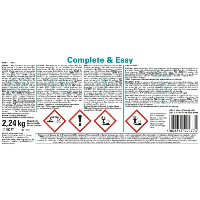 Bayrol Complete & Easy ist eine praktische wöchentliche Poolpflege-Kombination auf Chlorbasis, die gezielt zur Desinfektion deines Poolwassers, zur Entfernung von Trübungen und zur Verhinderung von Algenwachstum entwickelt wurde. Die Granulat-Kombination besteht aus zwei vordosierten Kammern – einer mit Chlorgranulat für eine zuverlässige Desinfektionswirkung und einer mit Wirkstoffen zur Algenprävention und Wasserklärung. Das integrierte Klareffekt-System sorgt für besonders brillantes Wasser, während die einfache Dosierung mit Doppelbeuteln den Pflegeaufwand erheblich reduziert. Bereits 15 Minuten nach der Anwendung ist der Pool wieder benutzbar. Complete & Easy ist frei von Kupfersulfat und eignet sich für alle Pooltypen und Filtersysteme.