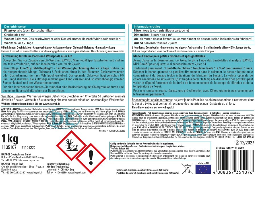- Unterstützt Algenverhütung, Kalkvermeidung und Chlorstabilität